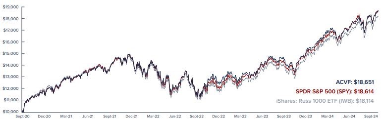 Washington, D.C., Oct. 30, 2024 (GLOBE NEWSWIRE) -- American Conservative Values ETF (ACVF) the leading conservative-principles investment fund marks its fourth anniversary proving a powerful point: investors don't have to choose between conservative principles and market returns. Since its October 2020 launch, ACVF has performed in lock step with the S&P 500(1) while aggressively boycotting companies that actively promote the liberal woke corporate agenda at the potential expense of shareholder value. Since its launch ACVF has raised over $100 million in assets. [Factsheet]